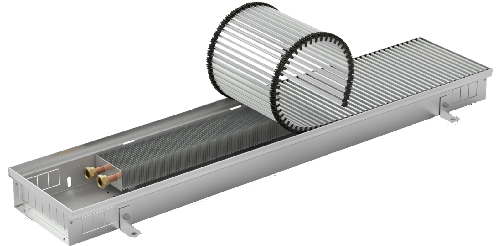 Obsah standardní dodávky žárově pozinkovaná ocelová vana, přírodní provedení nelakováno nelakovaný Al/Cu výměník tepla s odvzdušňovacím ventilem hliníkový rámeček U v provedení stříbrný elox krycí plech připojení rozpěrky pro správnou instalaci a betonáž stavěcí šrouby s nivelací cca 25 mm pro vyrovnání nerovností podlahy (až 8 ks podle délky konvektoru) a 4 fixační kotvy krycí sololitová deska chránící výměník před nečistotami odolné balení, návod k montáži