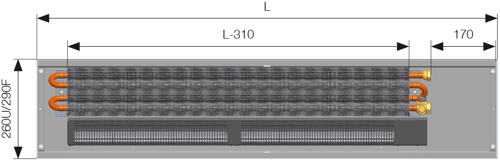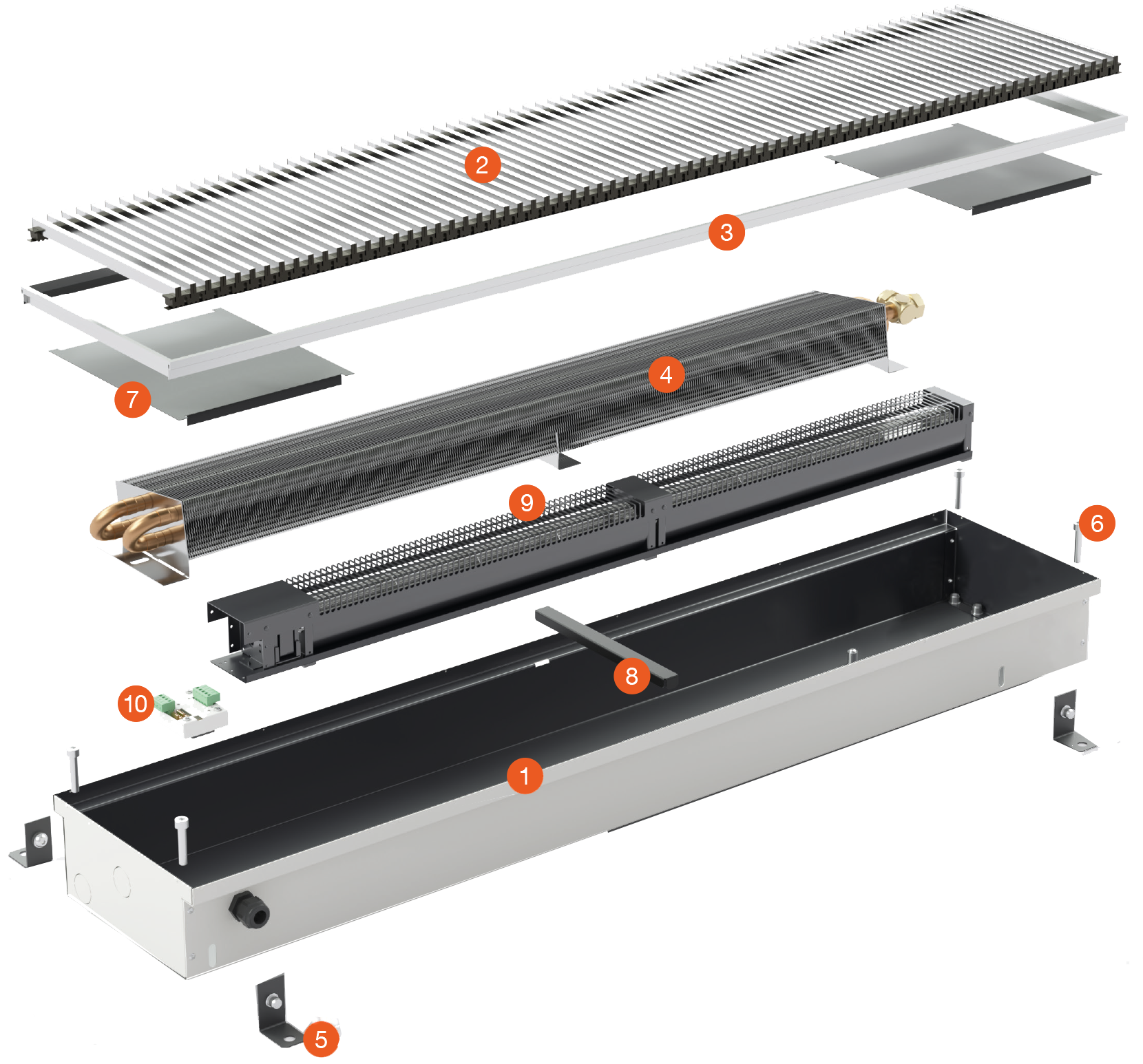 Obsah standardní dodávky ocelová pozinkovaná vana černě lakovaná RAL 9005 Economic – nelakovaný Al/Cu výměník tepla s odvzdušňovacím ventilem Exclusive – lakovaný Al/Cu výměník tepla s odvzdušňovacím ventilem v barvě černá RAL 9005 sestava nízkoenergetických EC ventilátorů 24 V DC připojovací svorkovnice pro 230 V AC a regulátor (FCR BOX) spínaný zdroj 230 V AC/24 V DC krycí plechy připojení hliníkový krycí rámeček U – stříbrný elox stavěcí šrouby a 4 fixační kotvy rozpěrky pro správnou instalaci a betonáž krycí deska sololit chránící výměník před nečistotami odolné balení, návod k montáži | Volitelné příslušenství krycí mřížka dle vlastního výběru krycí mřížka Cross – projektové řešení – nutné objednat současně s podlahovým konvektorem hliníkový rámeček U v provedení elox černý, elox světlý/tmavý bronz nebo lakovaný dle vzorníku RAL hliníkový rámeček F v provedení elox stříbrný, černý, světlý/tmavý bronz nebo lakovaný dle vzorníku RAL zdroj stejnosměrného napětí 24 V DC termoelektrický pohon TEP 24 V DC