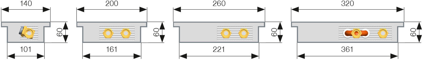 42 mm. • Při zalévání betonem je rovněž možné konvektor svisle zatížit. • Při betonování je velmi důležité konvektor rozepřít, aby nedošlo k podélnému prohnutí. K tomuto účelu jsou v podlahovém konvektoru instalovány rozpěrky (mimo varianty FKP, kde rozpěrky pro správnou betonáž nejsou součástí standardní dodávky). Po betonáži je možné tyto rozpěrky jednoduše vyjmout. • Při zalévání betonem nebo anhydridem je nutné důkladně utěsnit všechny prostupy do konvektoru tak, aby nedošlo k jeho zalití stavebním materiálem. • Pokud konvektor nebudete zalévat betonem, je nutné použít jednu z variant zabudování do zdvojené podlahy. Standardní provedení konvektoru není samonosné. • Aby se zabránilo znečištění vnitřku konvektoru, doporučujeme krycí desku ponechat po celou dobu stavebních prací. Standardně je dodávaná krycí deska sololit, která není pochozí a slouží pouze k zakrytí podlahového konvektoru před drobnými nečistotami po dobu montáže. Desku OSB ze zvýšenou tuhostí pro montážní účely, lze objednat z volitelného příslušenství. • Doporučujeme konvektor podél výměníku na boku vnější strany vany tepelně zaizolovat (např. polystyrenem), aby nedocházelo k tepelným ztrátám do podlahy. • Konvektory s nerezovou vanou, určené do vlhkého prostředí, označené KORAFLEX Pool FKP, mají standardně zabudovaný odtok pro odvod přelivové vody. Při montáži se musí propojit trubičkou na dně konvektoru s potrubím se zajištěným spádem pro odvod přelivové vody. Odtok doporučujeme vybavit sifonem proti zápachu. Doporučené umístění otopného výměníku v podlahových konvektorech • Navrhované umístění podlahového konvektoru je do maximální vzdálenosti 100 mm od okna. Doporučená poloha výměníku v konvektoru je pro získání maximálního výkonu vždy na straně u okna. Dochází tak k přirozenému proudění, při kterém ohřátý vzduch stoupá vzhůru a studený vzduch v místnosti je nasáván do konvektoru. Díky tomu je chladný vzduch u okna odstíněn a vzduch v místnosti ohříván. Standardní pravé připojení na topný systém je možné jednoduchým otočením výměníku tepla o 180° změnit na levé. | Napojování podlahových konvektorů Typy van podle umístění přívodů vody a snižování čel pro zapojení do série.
