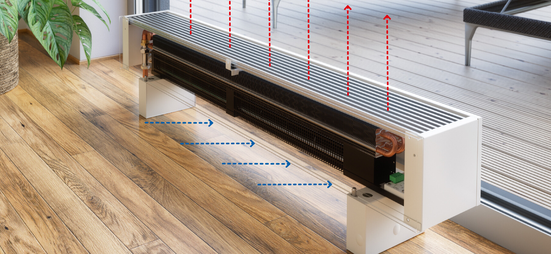 | Konvektorová tělesa s ventilátorem mohou být vybaveny funkcí chlazení nebo dochlazování, což umožňuje efektivní snižování teploty v místnostech. Tento obousměrný provoz zajišťuje celoroční komfort. |